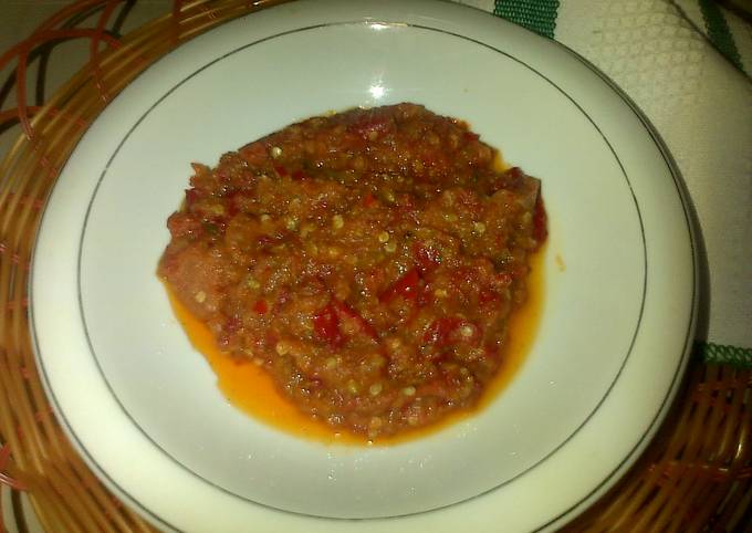- Haluskan bawang putih, cabe, terasi diatas cobek. Tambahkan garam & gula pasir. Setelah agak halus, baru mskkan tomat. Goreng lagi sambal dgn bekas minyak yg td spy sambal bs lebih tahan lama. Lgsg disajikan jg sdh bs. Tingkat kehalusan sesuai selera..