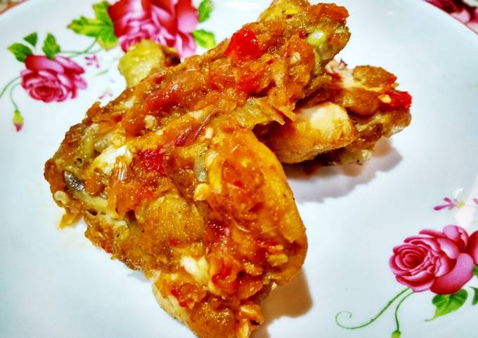 - Goreng ayam dengan minyak goreng secukupnya sampai matang dengan api sedang kemudian angkat dan tiriskan..