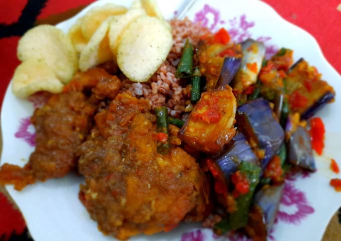 - Haluskan bahan2 sambel penyetan lalu penyet ayam dengan sambel penyetan terasi. Hidangkan dengan nasi merah hangat, tumisan terong ungu kacang panjang dan kerupuk rumput laut.