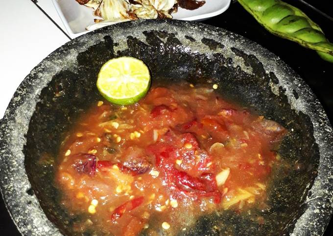 - Angkat. Tambahkan sedikit minyak bekas menggorengnya. Tambahkan garam, kaldu dan gula merah. Ulek, aku suka yg gak terlalu halus.